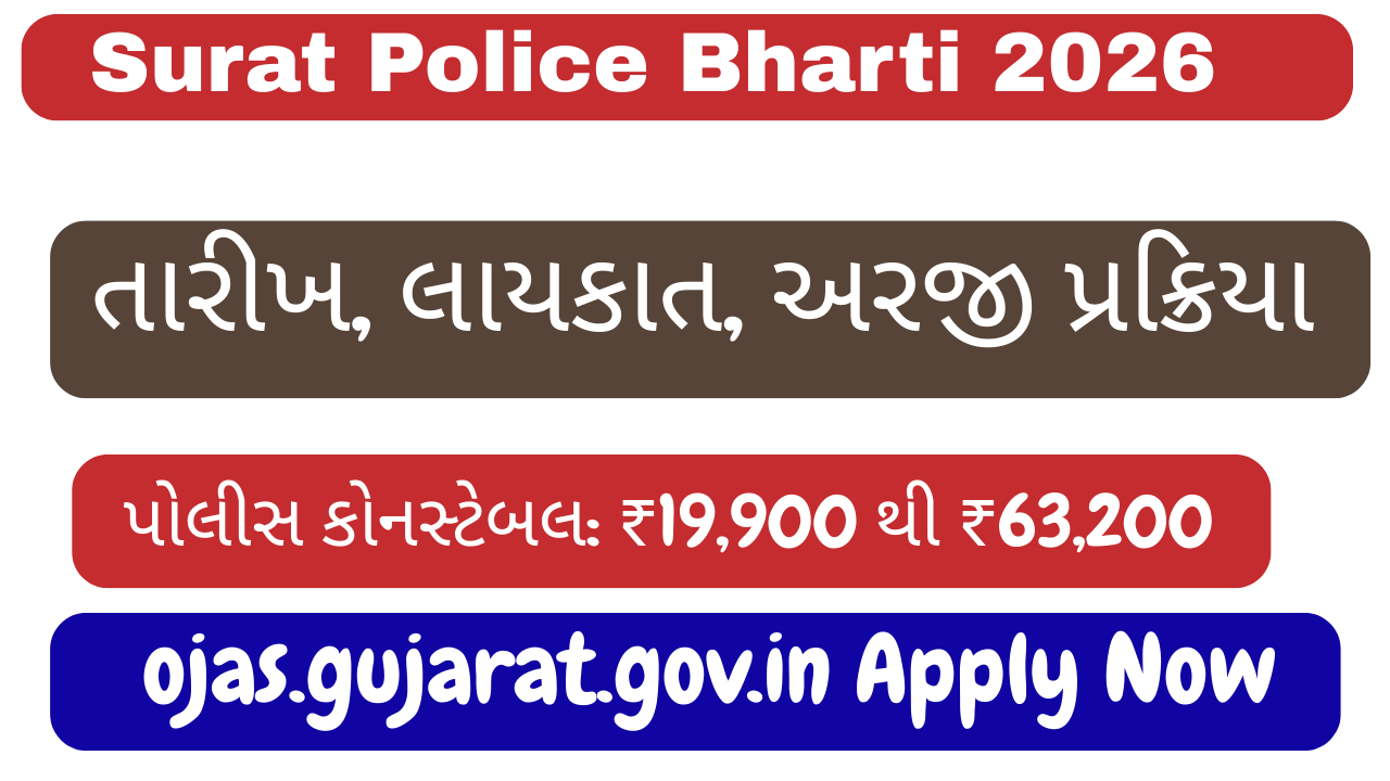 આ લેખમાં અમે સુરત પોલીસ ભરતી 2026 સંબંધિત નોટિફિકેશન, પદોની સંખ્યા, લાયકાત, વય મર્યાદા, પસંદગી પ્રક્રિયા અને ઓનલાઈન અરજી કેવી રીતે કરવી તેની સંપૂર્ણ માહિતી આપી રહ્યા છીએ.